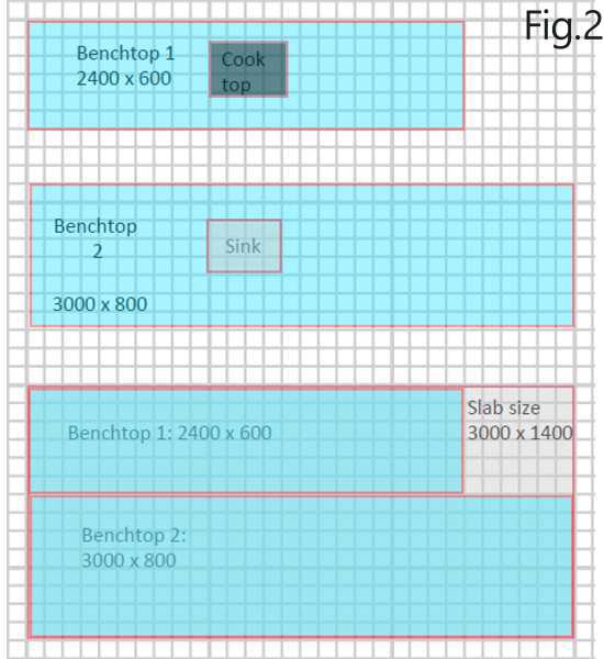 Traditionally slabs come in 3000mm x 1400mm slabs (or thereabouts). This is how engineered stone is sold. As a customer you have to purchase engineered stone per slab. The percentage of the slab that you use is known as the yield and what is left over is known as wastage. Obviously the more stone that is used in a project, the greater the yield and therefore better the value of the overall project. Figure 1&2 shows an example you can see two benchtop plans. Whilst benchtop A is considerably smaller than benchtop B (ref Fig. 1), if both benchtops have the identical finish with identical cutouts they will actually be the same price.